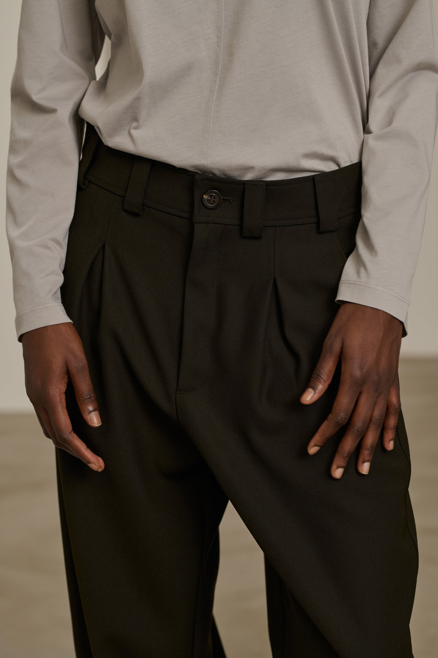 TIMON is a pleated trousers to be worn high-waisted with a belt and gathered, or low-waisted resting on the hips. It creates a controlled voluminous effect, paired with an oversized wardrobe. Match it with the TIMON trousers for a complete autumn look in wool gabardine.