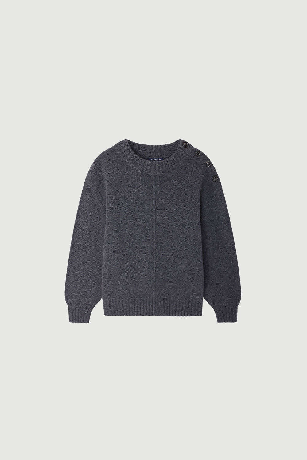 SACHA is a long-sleeved jumper, knitted from merino wool yarn. Its cut features a rounded effect, enhanced by dropped armholes and a buttoned opening detail along the shoulder. A visual knitting effect provides a subtly blended signature in the anthracite grey of its shade.